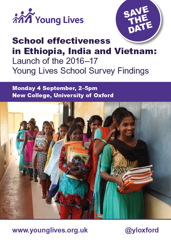 Share Breadcrumb Home News & Blogs Save the Date: Young Lives School Survey Findings Launch, September 2017 Save the Date: Young Lives School Survey Findings Launch, September 2017 04 September 2017 Education and Skills School effectiveness News