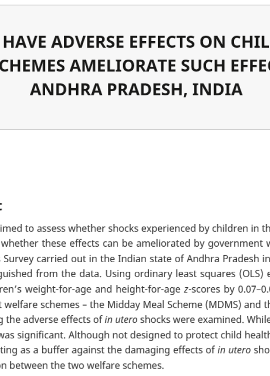 This study uses Young Lives evidence to assess whether shocks experienced by children in the mother’s womb can have an adverse effect on their future health, and whether these effects can be ameliorated by government welfare schemes. Data were taken from three phases of the Young Lives Survey carried out in the Indian state of Andhra Pradesh in 2002, 2007 and 2009–2010. Different types of in utero shock were distinguished from the data. Using ordinary least squares (OLS) estimation, it was observed that multiple in utero shocks reduced children’s weight-for-age and height-for-age z-scores by 0.07–0.08 and 0.08–0.15 units respectively. The roles of two Indian government welfare schemes – the Midday Meal Scheme (MDMS) and the National Rural Employment Guarantee Scheme (NREGS) – in mitigating the adverse effects of in utero shocks were examined. While the effect of the MDMS was statistically insignificant, that of the NREGS was significant. Although not designed to protect child health, the NREGS has been playing a more effective role than the MDMS in acting as a buffer against the damaging effects of in utero shocks on child health. The study points to the need for greater co-ordination between the two welfare schemes.