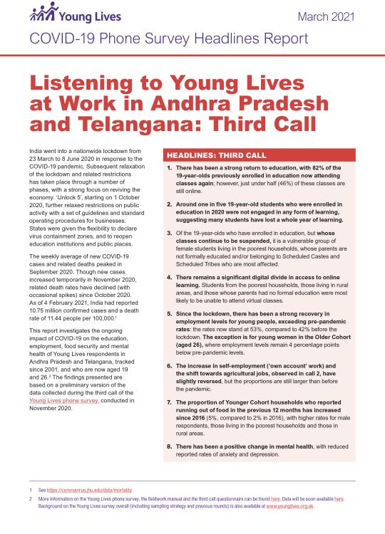 This brief report provides headline findings from the third call in Young Lives at Work's COVID-19 Phone Survey in India.