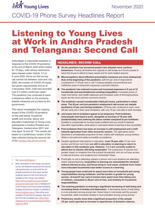 This brief report provides headline findings from the second of the three calls in Young Lives at Work's COVID-19 Phone Survey in India (Andhra Pradesh and Telangana)