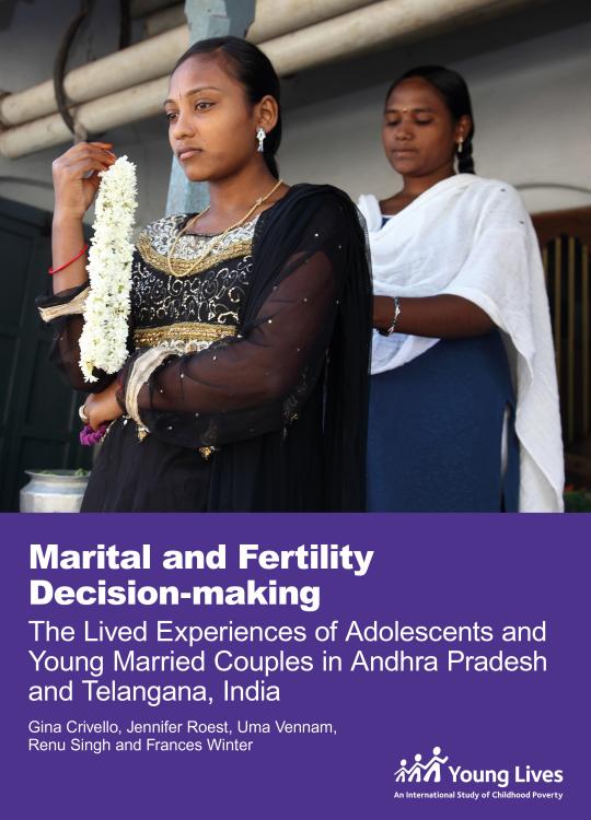 This report presents findings from a qualitative sub-study exploring adolescent girls and young couples’ experiences of marital and fertility decision-making in two southern Indian states (Andhra Pradesh and Telangana). Andhra Pradesh and Telangana are among the top states reporting high adolescent fertility: 12 and 11 per cent of young women age 15-19 in Andhra Pradesh and Telangana, respectively, were already mothers or pregnant when surveyed in 2015/16. This research was carried out as part of Young Lives, a longitudinal study of childhood poverty that traced the life trajectories of 3,000 children (in two age groups) and their households located in these states, over a 15-year period. By age 18, around 30 per cent of girls in the Young Lives study had married, and 23 per cent of these married girls had also become mothers.