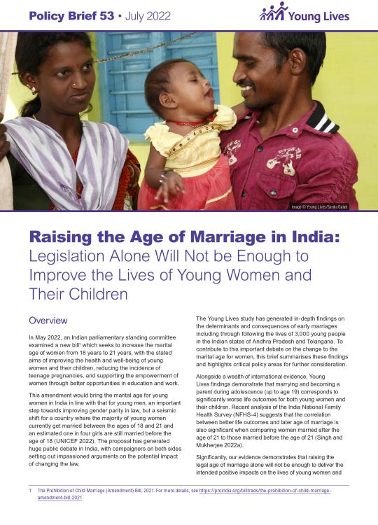 Young Lives has been following 3,000 young people in India (in the states of Andhra Pradesh and Telangana) from childhood into early adulthood, generating in-depth finding on early marriage. This brief summarises these findings and argues that whilst improving gender parity in law would be a seismic shift for a country where the majority of young women currently get married between the ages of 18 and 21, legislative change alone is not enough to achieve the intended positive impacts.