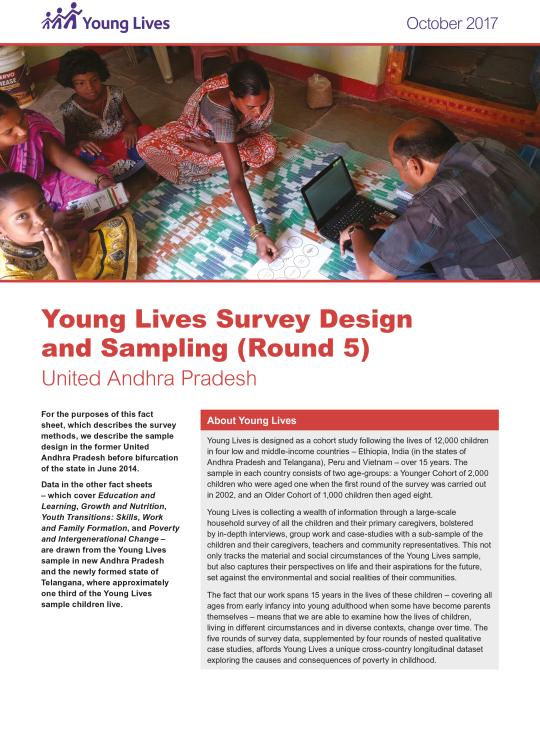 This fact sheet describes the survey methods and sample design of the Round 5 Young Lives survey in India. It covers: the Young Lives sample design; how the regions, districts and communities were selected and the sample children identified; a brief description of the sentinel sites; attrition rates; and brief comparison of Young Lives with other datasets.